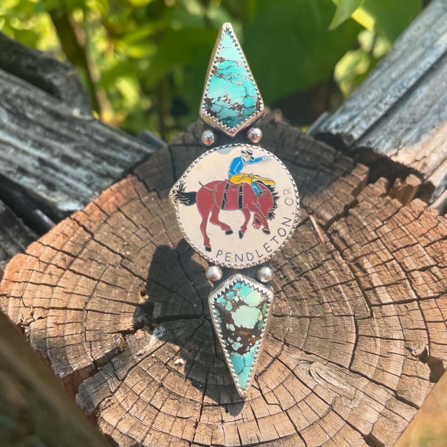 Treasure mountain turquoise and vintage Pendleton roundup pin